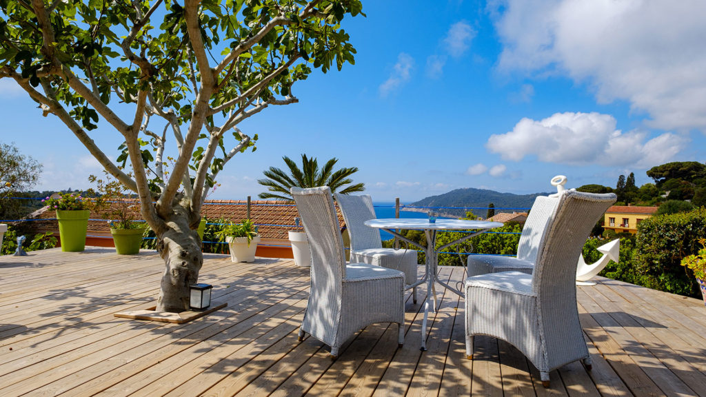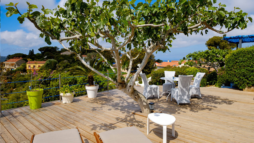 Il donne de plein pied sur sa terrasse privative de 60 m2 avec vue panoramique. Pour votre détente, chaises longues, douche extérieure, Coin repas protégé par un superbe figuier qui vous assure un doux ombrage l’été.