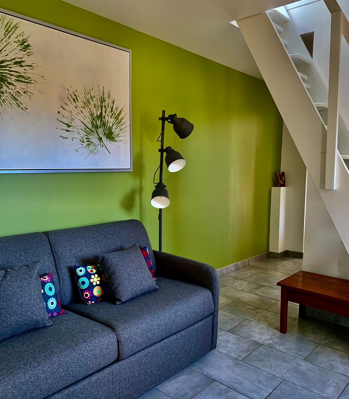 L’Appartement Fogo, avec sa terrasse privative ouverte sur un jardin exotique, vous séduira par son espace généreux et son ambiance chaleureuse. Idéal pour un couple mais pouvant accueillir jusqu’à quatre personnes, il offre le confort d’un vrai chez-soi. Il se compose d’un salon avec canapé convertible, d’une chambre en mezzanine d’une salle de bain complète ainsi que d’une cuisine toute équipée (frigo – four – lave vaisselle – micro onde – plaque vitrocéramique – cafetière – cafetière Nespresso – bouilloire – grille pains – vaisselles …)