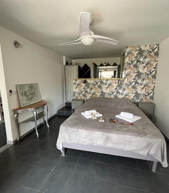 La chambre est équipée d’un ventilateur de plafond qui rafraichit agréablement la pièce en été. Un frigo et un micro ondes sont à votre disposition sur la terrasse, avec un nécessaire pour préparer le petit déjeuner dans la chambre (bouilloire et tasses…)