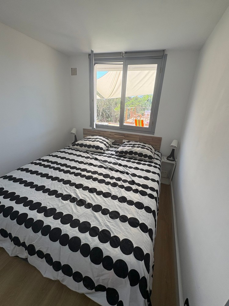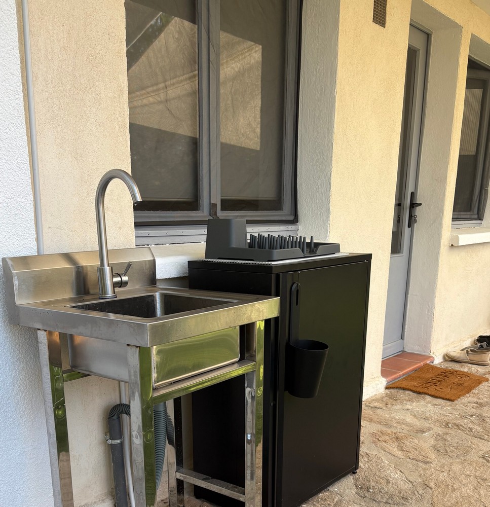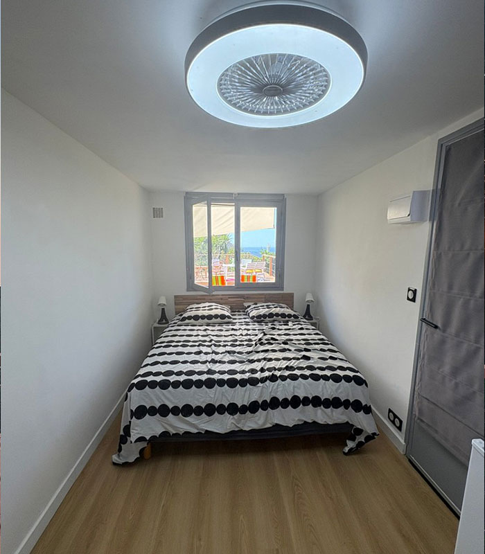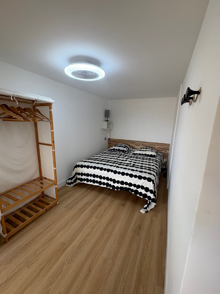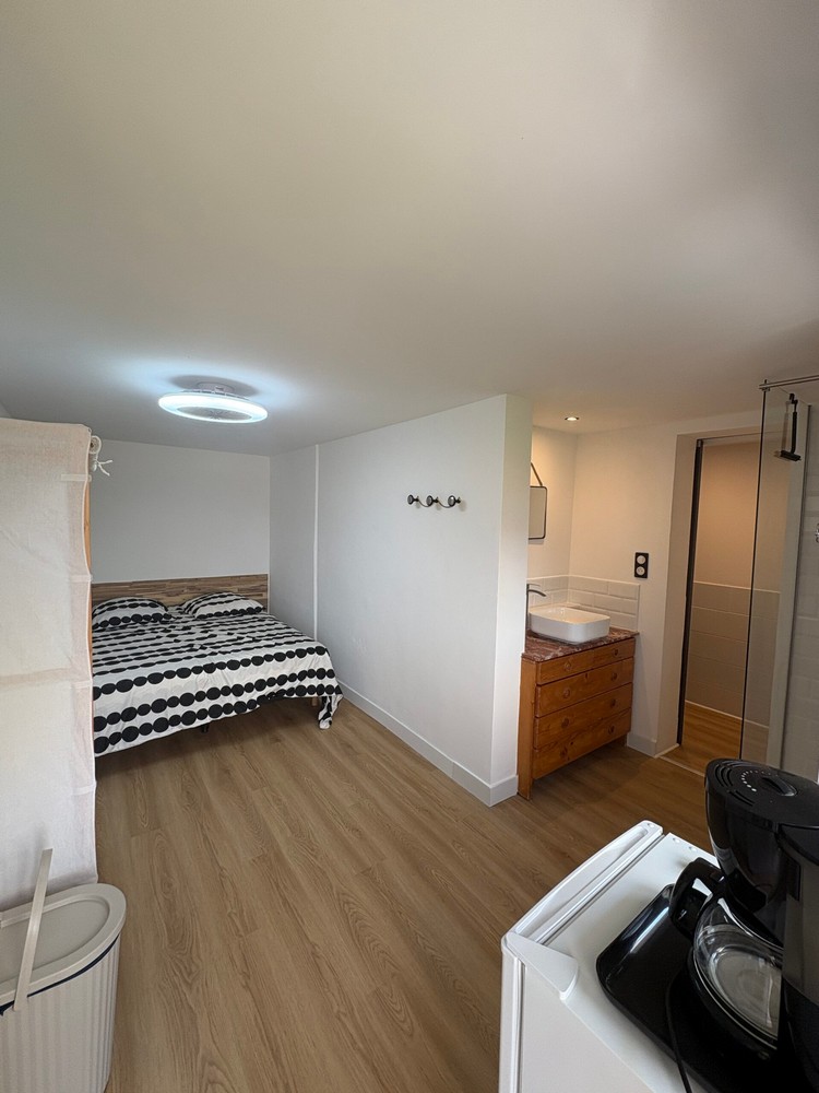 Une première chambre de 11 m2 équipée d’un lit double (160×200), ventilateur plafond ,d’une salle de bain et toilette séparées. Cuisine extérieure avec évier et plaque à induction, vaisselle, cafetière filtre et bouilloire.