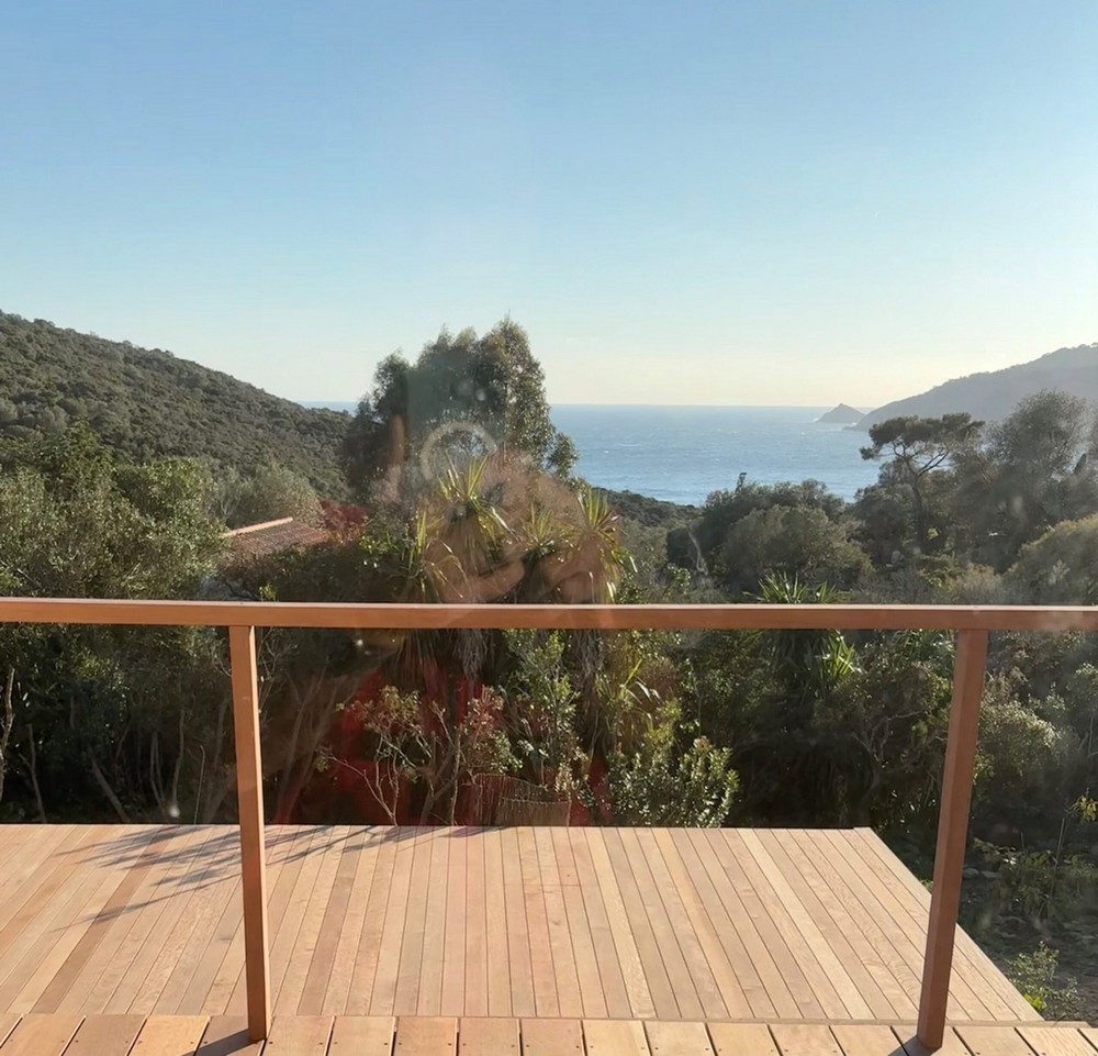 Chambre équipée d’un lit double (160×200), d’une salle de bain et toilette séparées. Cuisine extérieure avec évier et plaque à induction, vaisselle, cafetière filtre et bouilloire. Dispose d’une très grande terrasse partagée avec vue dégagée sur le maquis et la mer. Draps et serviettes fournis pour une location de 3 nuits minimum.