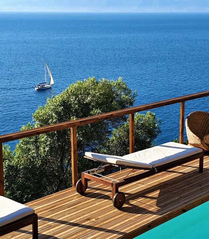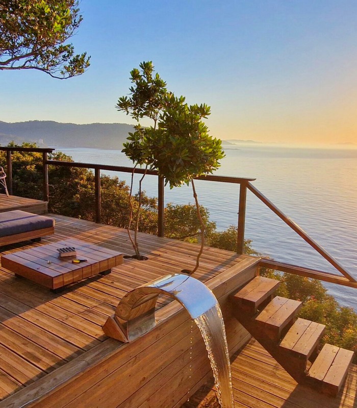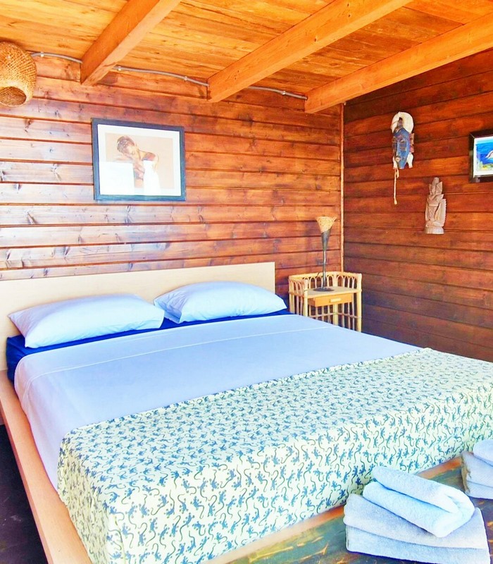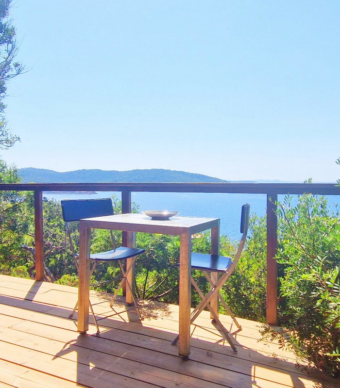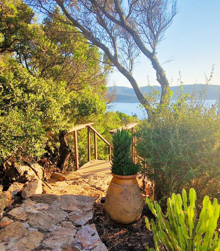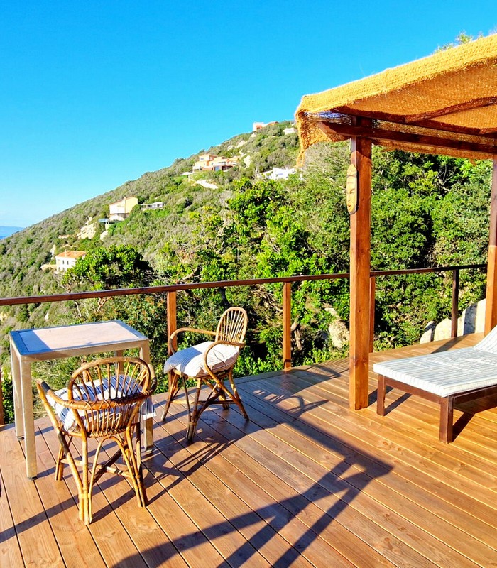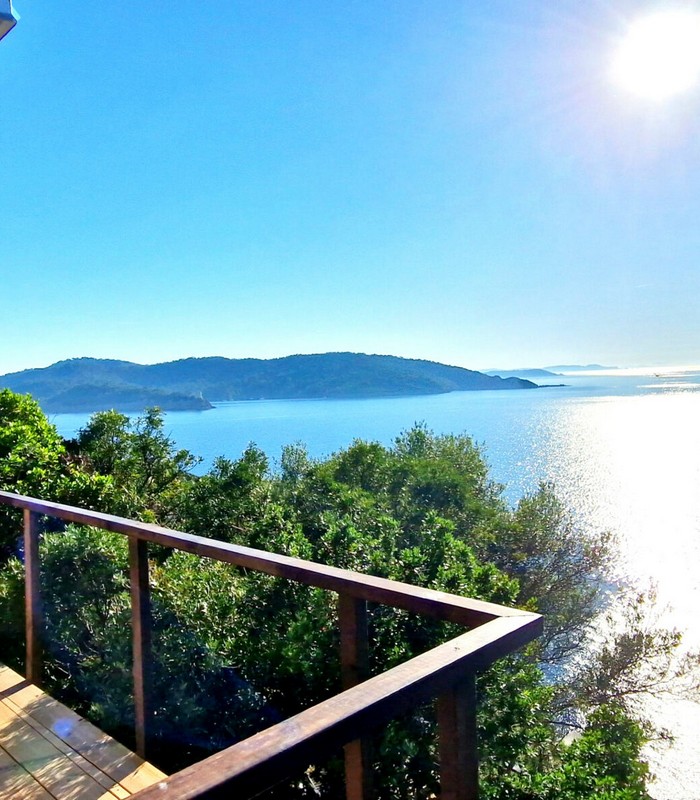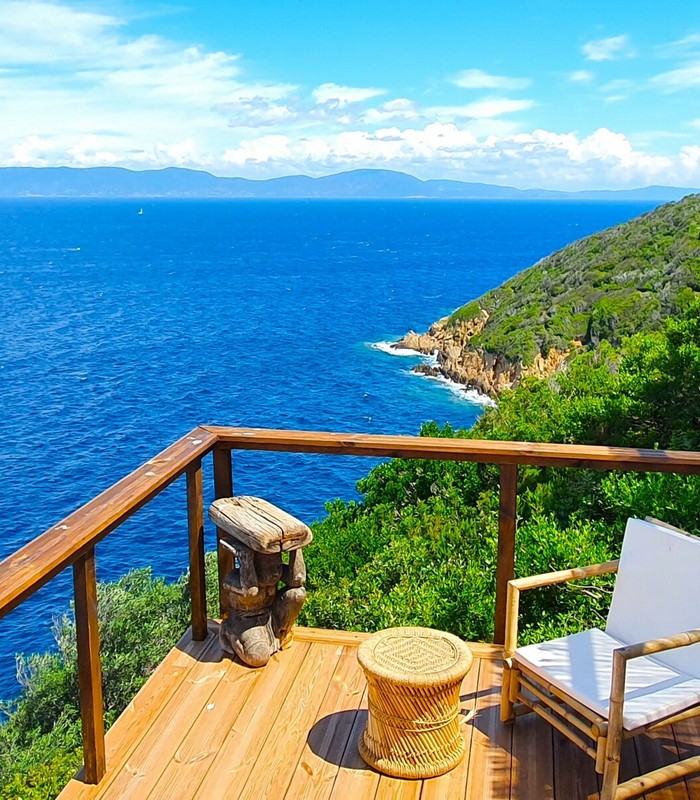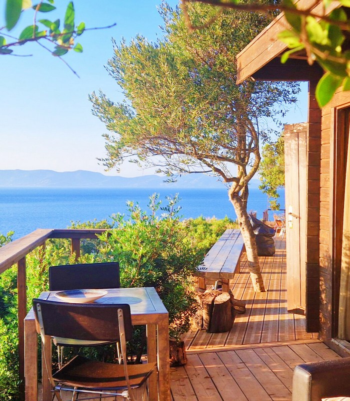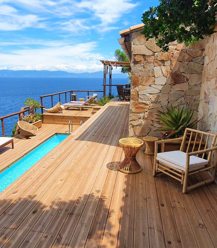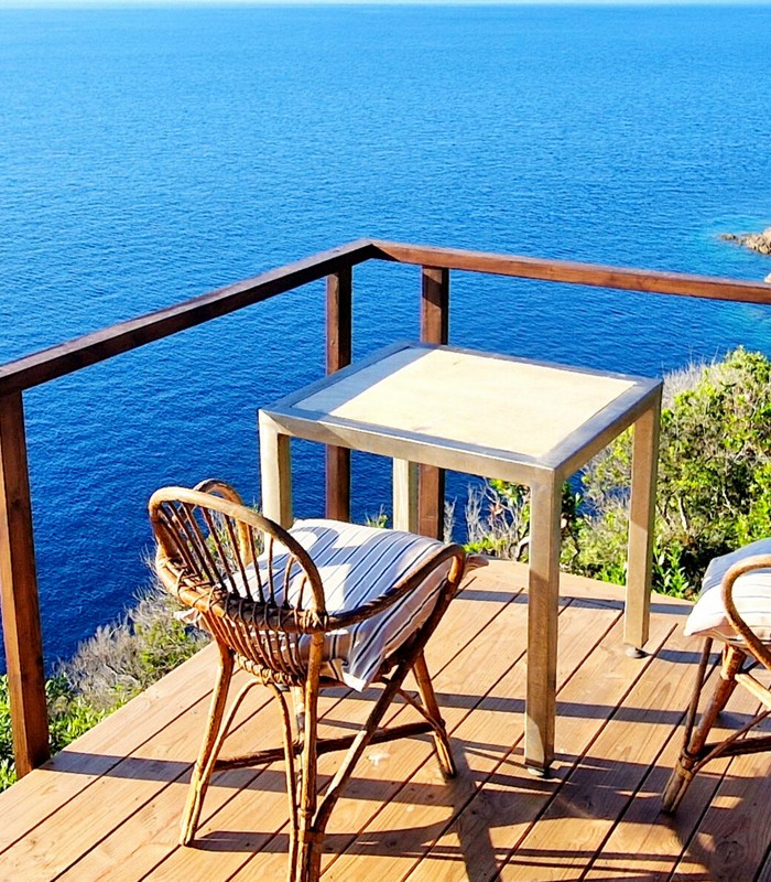 3 Lodges isolés sur les rochers face à la mer dans un jardin de plus de 2 800 m² avec un vue panoramique à 180°. Chaque lodge a sa terrasse privative sans vis-à-vis. Piscine commune. Espace training