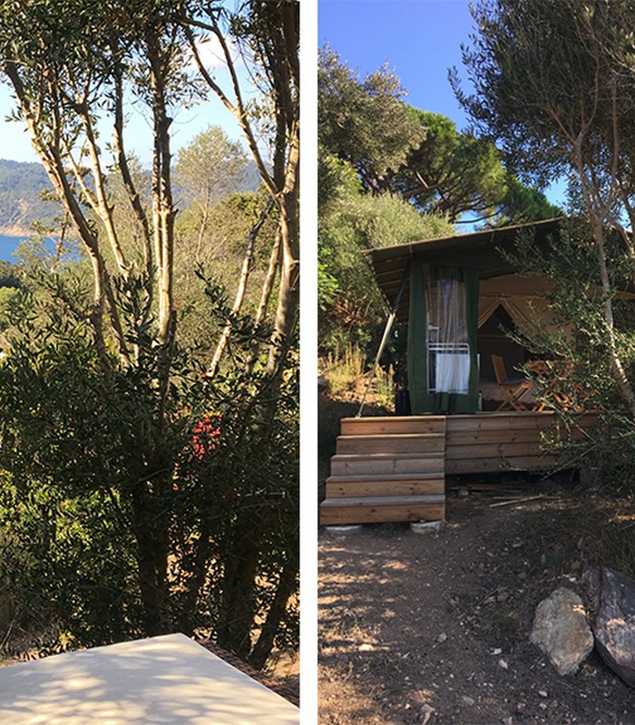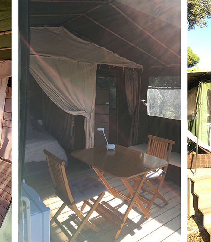3 Tentes Safari version «Out of Africa», posées sur une plateforme de 30 m2 en bois sans vis-à-vis, entourées d’arbres avec chacune une terrasse (avec mobilier de jardin et vue sur mer).