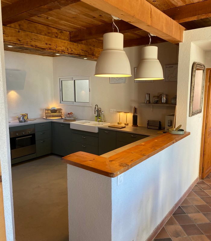 De plain-pied, baignée de lumière grâce à ses nombreuses fenêtres, avec une belle hauteur sous plafond, la maison est confortablement équipée avec une cuisine ouverte sur la salle à manger, un séjour, une chambre, une salle de bain et une belle terrasse.