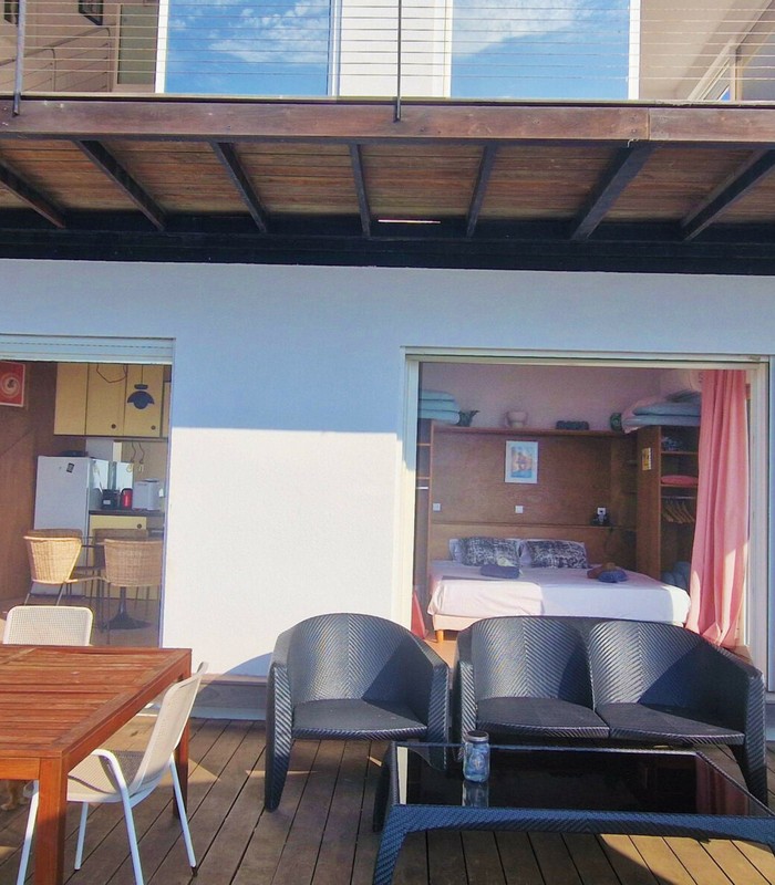– d’un niveau principal avec un salon /salle à manger, une grande chambre séparée du salon par des cloisons coulissantes, une salle d’eau, des WC, une terrasse sur deux côtés de la maison
