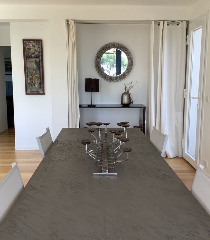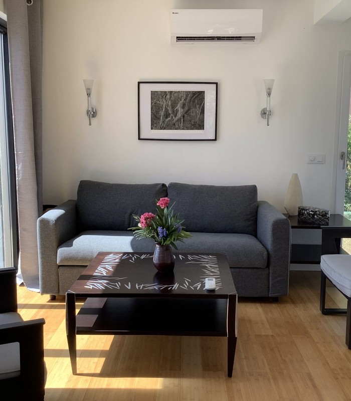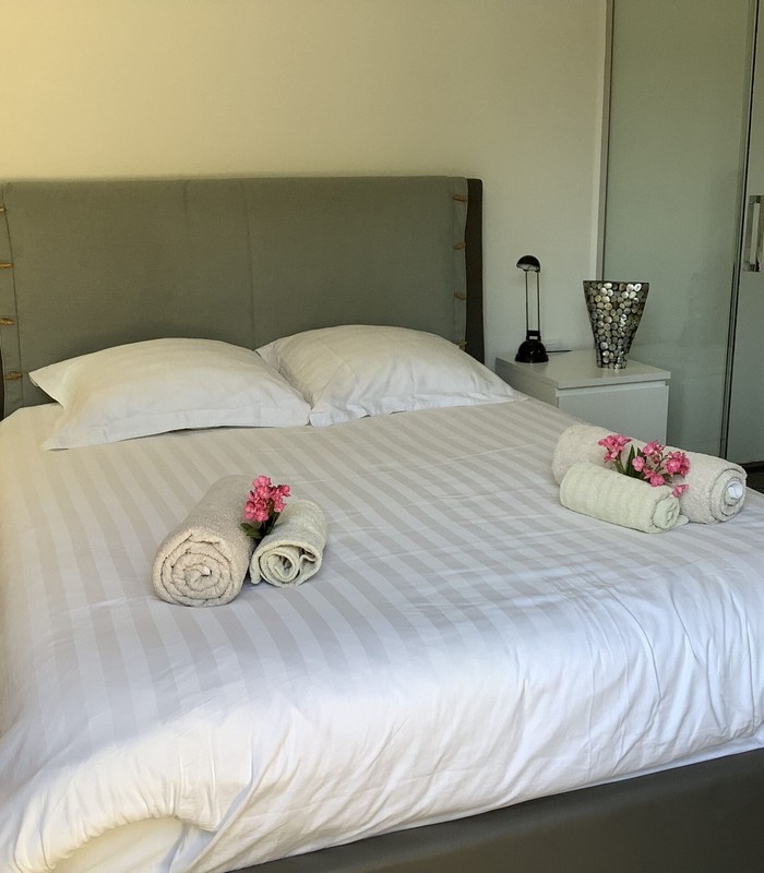 L'appartement de standing accueille jusqu'à six personnes avec deux chambres à lits queen-size, un salon avec canapé-lit et une cuisine équipée. Ses deux terrasses offrent une vue sur le jardin et la Méditerranée.