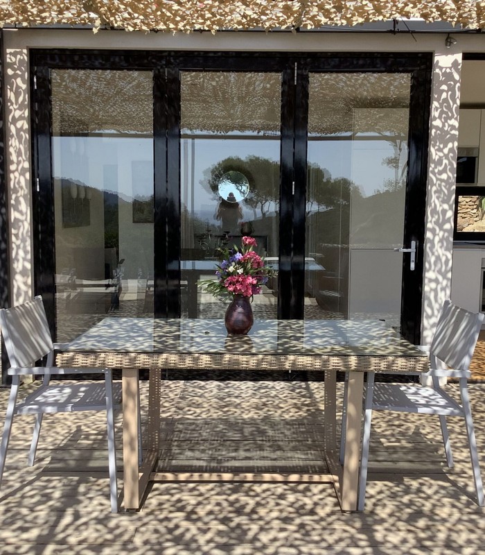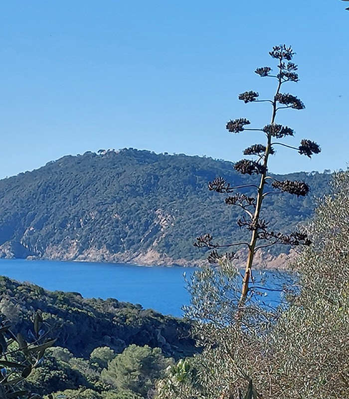 - Terrain arboré de 2400 m² avec vue sur Port-Cros : La propriété s'étend sur un vaste terrain planté d'arbres offrant intimité et espaces verts, avec une perspective directe sur l'île de Port-Cros et la mer Méditerranée.
