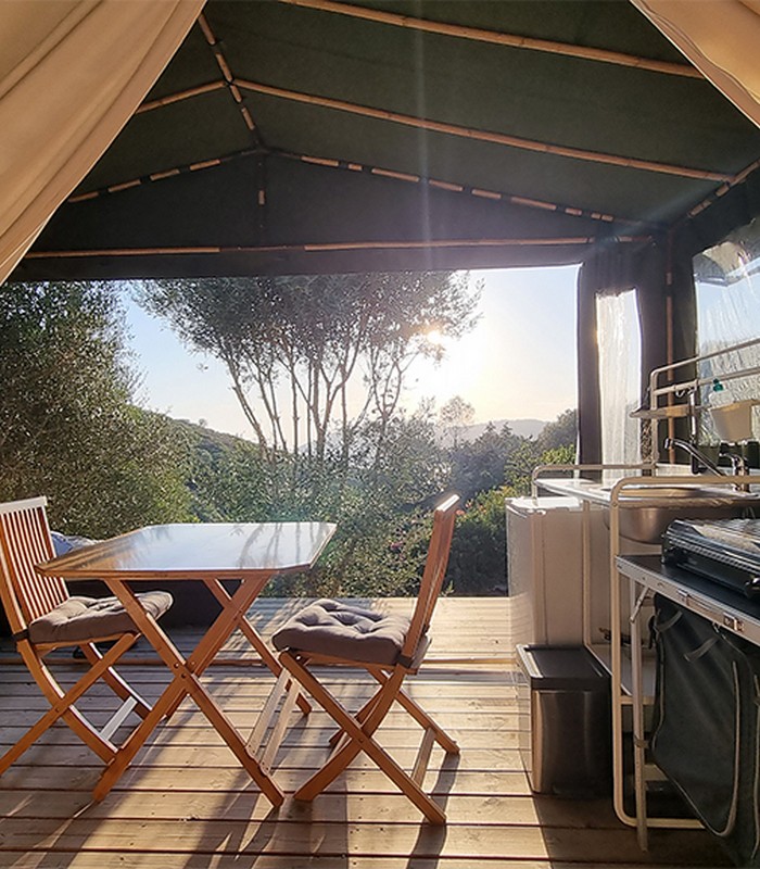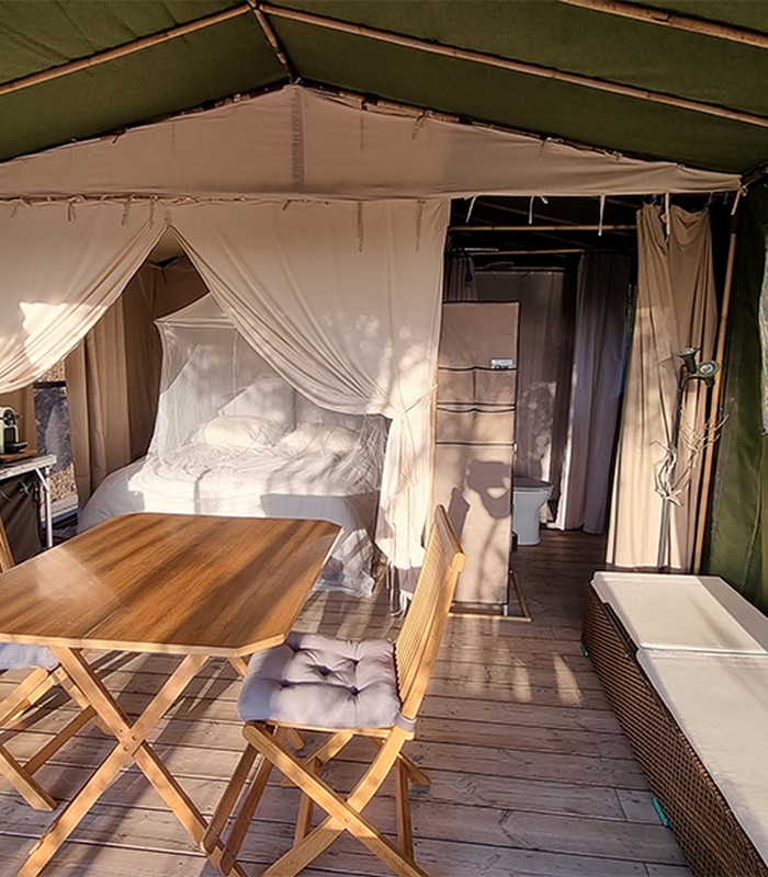 - Lodges Safari de style "Out of Africa" : Les tentes Safari installées sur plateformes en bois sans vis-à-vis offrent une expérience unique d'hébergement sous toile, avec tout le confort nécessaire (cuisine équipée, salle d'eau, literie de qualité) et une terrasse privative avec mobilier de jardin.