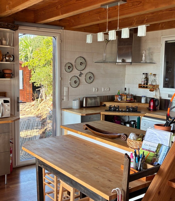 La villa Les Marecottes est bioclimatique entièrement en bois, construite en 2006 sur pilotis pour préserver la végétation naturelle. Plusieurs terrasses et un espace détente avec une petite piscine vous accueilleront au soleil ou à l'ombre. Cette maison de 90m² offre quatre chambres (deux lits en 160 et deux lits en 140) et dispose d'une cuisine parfaitement équipée ouverte sur le salon et les terrasses, permettant aux cuisiniers de profiter de la vue et de rester et des convives. Les portes balinaises sculptées ajoutent au caractère chaleureux de l'intérieur bois. La chambre du capitaine au premier étage bénéficie d'une terrasse privative et d'un grand espace avec lavabo. Les équipements comprennent une grande salle de douche en teck au rez-de-chaussée avec WC, un WC indépendant avec grand lavabo, une douche extérieure "à la levantine" (selon restriction d'eau), des ventilateurs dans les chambres, un climatiseur à chaque étage et pour l'hiver un poêle et des convecteurs. Toutes les fenêtres sont équipées de moustiquaires.