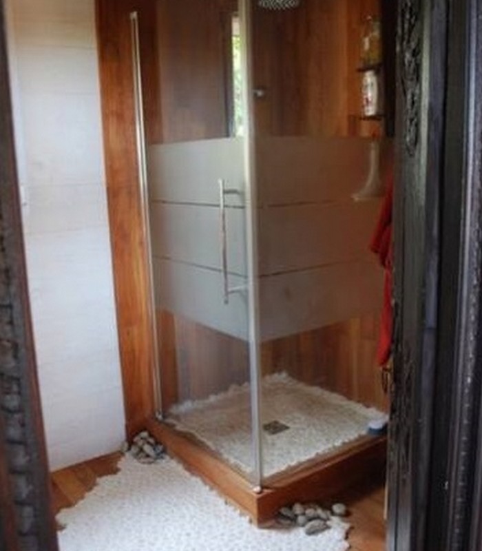 Les 4 chambres ont chacune un lit double, 2 de 160 et 2 de 140. Le charmes des portes balinaises sculptées ajoute à la chaleur du bois et du poêle en hiver. Les canapés sont fixes. Et pour la climatisation, vous avez une configuration naturelle étudiée en ouvrant ici ou là et jouant avec les volets mais aussi avec des ventilateurs, 2 climatiseurs et des convecteurs pour l’hiver.