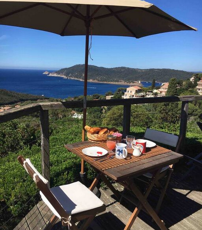 La villa, bordée sur deux côtés par le terrain militaire garantissant une absence totale de vis-à-vis, offre une vue panoramique de 270° dominant la garrigue et la Méditerranée, depuis le large de la côte militaire jusqu'au Cap Bénat, en passant par les îles de Port-Cros et Porquerolles.