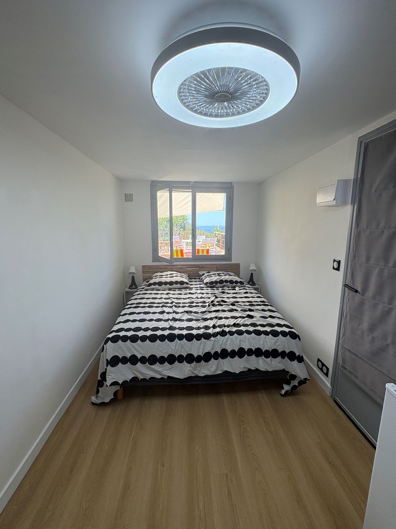 Les deux chambres donnent sur une grande terrasse partagée avec vue dégagée sur l’îlot de la Gabinière , mer et plantes exotiques.